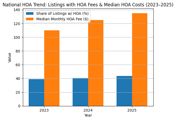 Median monthly HOA fees rose from approximately $110 in 2023 to $135 by 2025, increasing the true cost of homeownership.